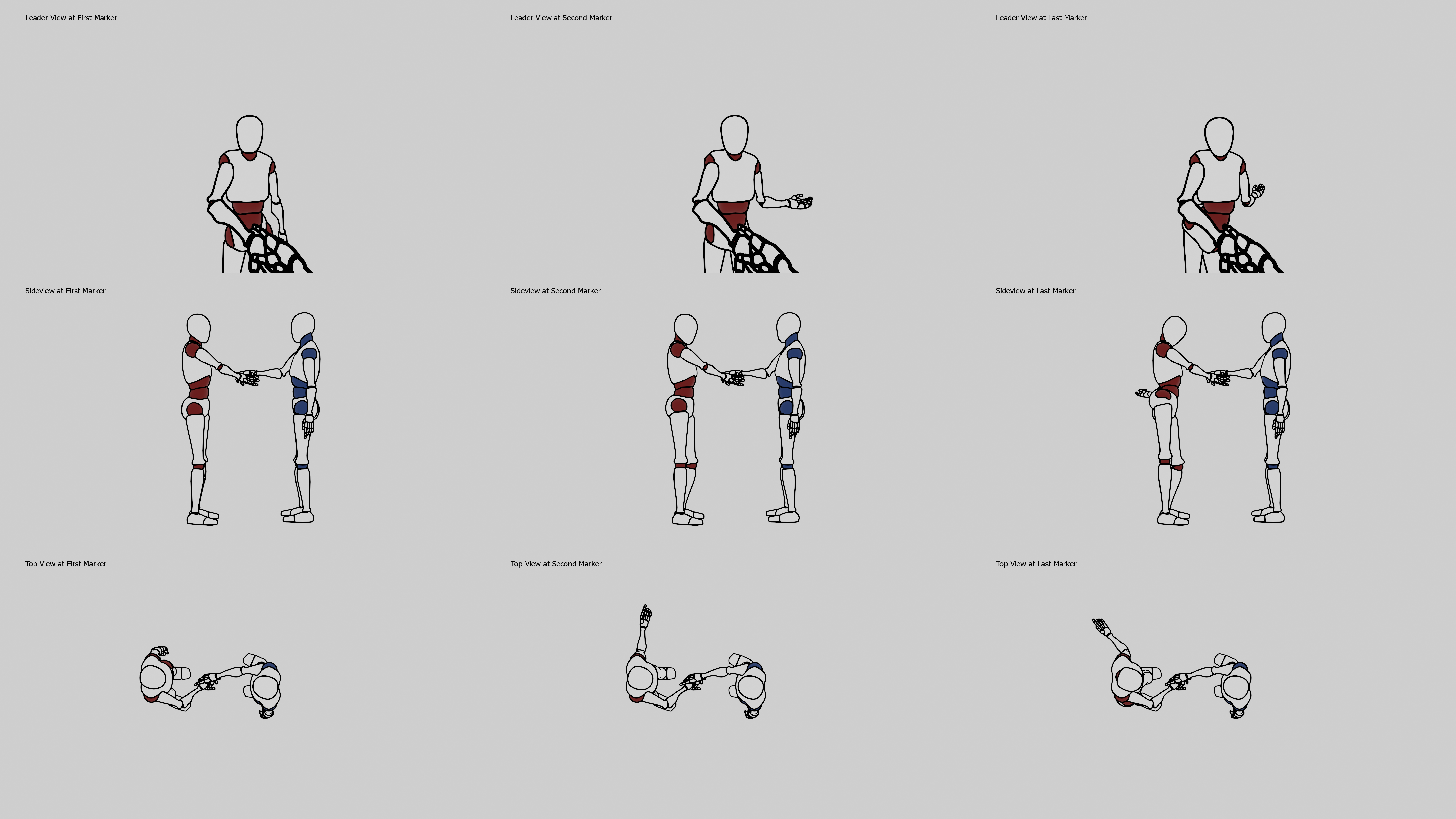 Messing around with the animation software also helped me explore how the position and poses of two people can be written down and characterized. In particular, around the fall of last year I figured out and proved to myself that there are only 15 ways for two people to connect through only their hands, which was very surprising and interesting to me. Some of them can be seen below, another image I produced in Blender.